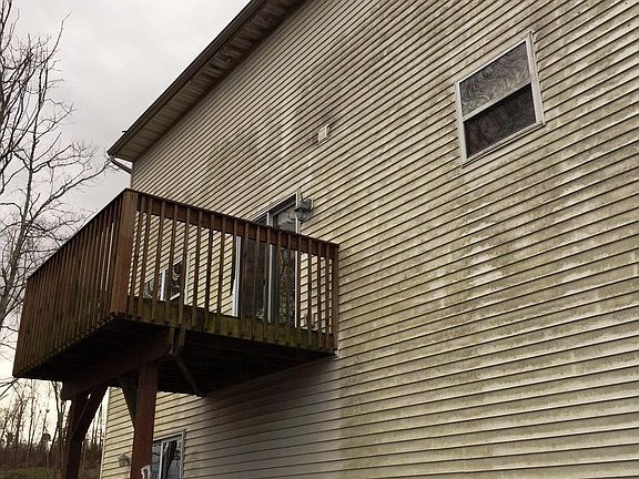 1 acre lot with seasonal view,lots of trees! Good floor plan-living room,formal dining room with open kitchen with walkout to deck.Half bath on 1st floor. Owners bedroom has walk-in-closet and private bath. Convenient builtin garage. Basement has sliding glass door walkout to yard-good space to add extra living space. City water also. Does needs work as is. Mold in garage .Investors welcome!