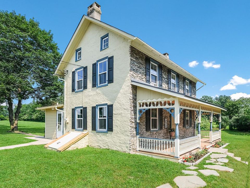 If you have interest in a circa 1700 PA fieldstone Farmhouse on over 2+ acresThe Main home has the original refinished floors and original doors, a country eat-in kitchen with lots of cabinets, a pantry, Granite countertops, tile backsplash, brand new Stainless Steel appliances and breakfast area with Tiffany fixture. A new powder room is conveniently located on the first floor in the laundry room. The entire home has new Simonton insulated windows through out and has been painted inside and out. The front porch has a new wooden ceiling, floors that are reclaimed wood from a whiskey barn in Tennessee, plus a brand new metal roof over the front porch. There are two newer free standing room air conditioners (not window units). The second floor has two good size bedrooms and a new ceramic bath with vanity, farmhouse grey floor, new stall shower with glass doors and a pocket door. There is a spacious third floor attic that could be used as a third bedroom. The entire Home was just painted on the exterior with the front porch having original gingerbread posts and railings . There is another free standing building that has a FANTASTIC large 23 x 26 workshop/garage with a functioning vacuum saw dust system. The temperature controlled workshop has a new Mitsubishi heater/air conditioner and could be an Art Studio or whatever your creative juices can imagine. It could also be used as a garage for exotic cars that require controlled heat and air conditioning. The property has a decent size BARN that has a second floor that needs some attention but it is functioning and has some electric. The BARN has been inspected by BUSTAMONTE Structural Engineer in 2017 and the Contractor corrected the issues. Use your imagination for that extra bonus space or studio. The owners are having a BRAND NEW heater h/w Boiler installed with transferable Warranty to the new owners. The base board water heat has two ZONES for both the first and the second floor! Behind the BARN is a Chicken Coup for those who want to raise chickens and eat fresh eggs. Attached to the barn and house is a RING camera and security light system that is included. Recent Well and Septic test results online. This home is ready for the next owners to be a part of its history. Originally built in 1700 before George Washington was here ! ! Unfortunately this is one of the few homes that Washington didn't sleep in! Take a look at the professional pictures and they speak a thousand words! BONUS: Location is 10 minutes from Lake Nockamixon recreation area!