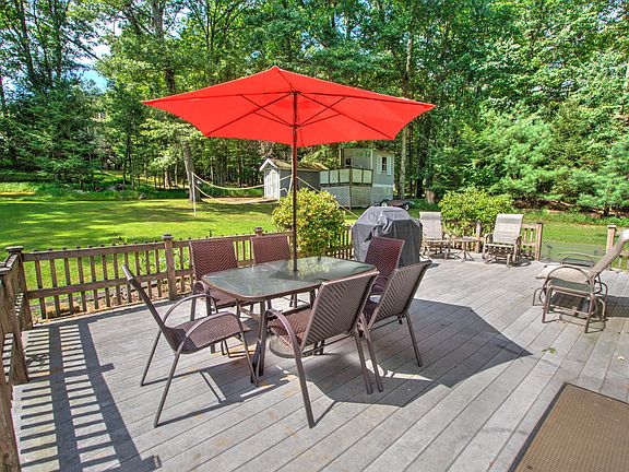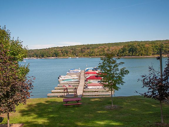 Walk to your Lake Wallenpaupack Boat Slip from this Spinnlers Point home! Everything you want in a lake cottage... 4 bedroom, 2 bath w/knotty pine interior, fireplace (recently re-done), granite counters, newly installed central AC & heat pump and master on 1st! Venture outside and enjoy overlooking the lake (seasonal views) from your 3-season enclosed porch or head to the back yard and watch the wildlife from your spacious Trex deck & large backyard w/fire pit & tree house. All furnishings, dishes-linens & TVs go with home.Also included: Small ATV, snowblower, gas weed whipper, gas chainsaw, log splitter, 2 person kayak, small trailer.