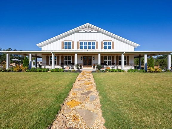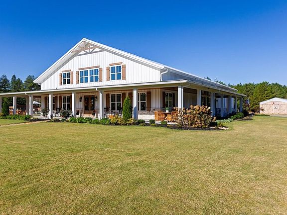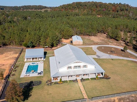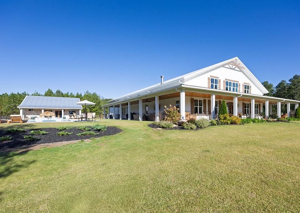 Welcome to this breathtaking custom barndominium with loads of finished space that is nestled on 30 picturesque acres of fenced pasture and wooded serenity. Plus an additional second home, this property offers exceptional versatility -- perfect for a family estate, horse farm, or a possible wedding venue. Step inside to discover a spacious 60' x 33' great room with soaring ceilings, a grand wood-burning fireplace with gas starter, and a custom mantle crafted from reclaimed wood from Jasper, GA. The open-concept kitchen is a true showpiece, featuring 2 large islands, Cafe appliances, a six-burner gas range, double ovens, three dishwashers, a double refrigerator with beautiful bronze fixtures, a farmhouse sink, and quartz countertops. The walk-in pantry room includes butcher block counters, a second sink, and space that could easily double as a home office or prep area. Luxury continues throughout with Coretec LVP flooring and thoughtful custom touches in every room. The laundry/mudroom features brick flooring, a gentle wash sink, custom washer/dryer station, built-in dog bath and shower, and even a pot filler for pet care convenience. Three fireplaces, including one in the master bedroom that adds warmth and character throughout. The unbelievable master bath offers a spa-like retreat with a free-standing tub and a large walk-in shower with multiple shower heads. The second home includes a gorgeous kitchen with a large butcher block island, leathered granite countertops, a gas stove, and a huge farmhouse sink and roll-up window. It offers two bedrooms and one and a half baths, with the full bath featuring a walk-in shower. And this home has a second washer and dryer for added convenience. Outdoors, enjoy a large, resort-style in-ground pool surrounded by beautifully landscaped flowerbeds, all maintained by a full sprinkler system. Exterior speakers make this the perfect space for entertaining or relaxing. Sprawling fenced pastures, mature trees, and peaceful surroundings make this one-of-a-kind property the ultimate blend of modern luxury and rustic charm. A rare opportunity to own a truly extraordinary estate -- ready to welcome you home.