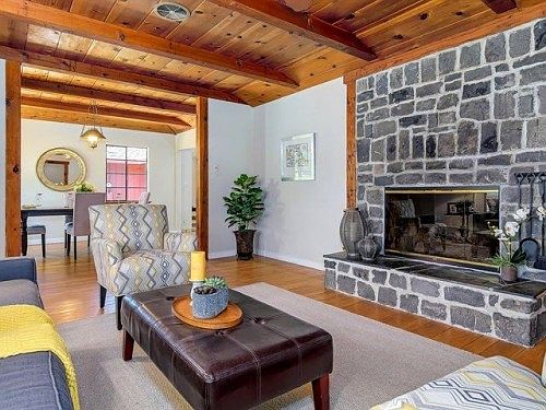 Lovely home on flat lot, no rear neighbors. Beautiful hardwood floors & ceiling in liv & din rms w/ impressive stone fireplace w/gas starter. Kitchen open to din rm w/ island. New carpet in 2 beds. Fresh Interior paint thru-out. A/C. R/V parking. Room for a pool.