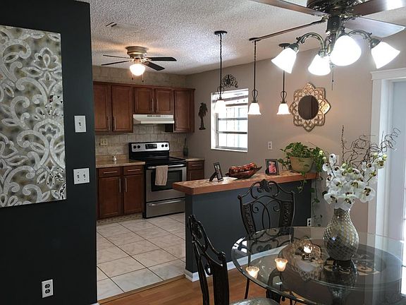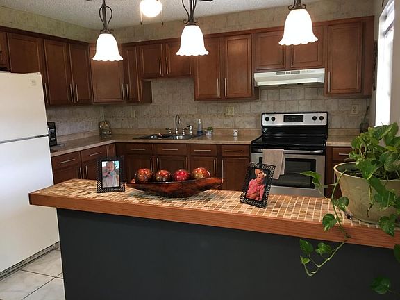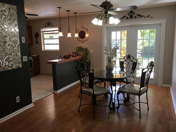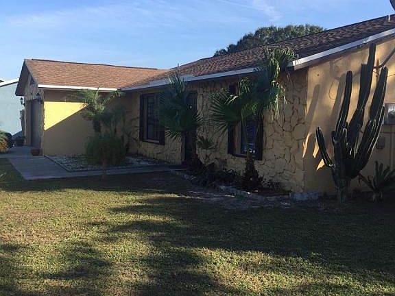 Located on a cul-de-sac, this CBS pool home has been beautifully upgraded. This home features a split floor plan and has laminate wood and tile flooring throughout. Both bathrooms are updated. The newly designed kitchen is open to the dining area which has french doors leading out to a huge covered and tiled patio (648 sq. ft.) which greatly expands Florida living! Located on a large fenced lot complete with extended patio space, beautiful built-in pool, custom built-in benches and fruit trees that include an avocado, mango and coconut! Also included are accordion shutters, brand new stove, washer and dryer. A pleasure to see...