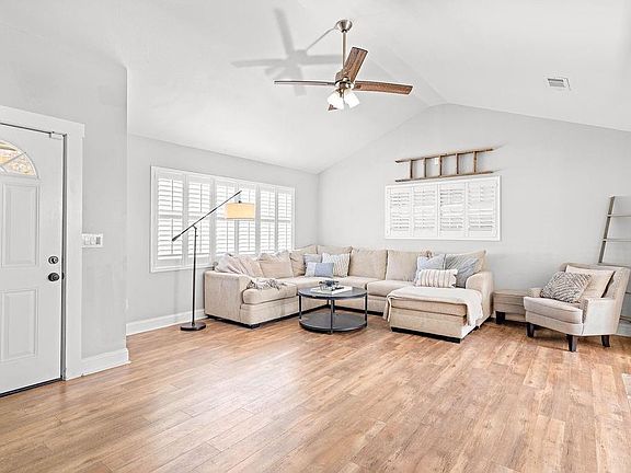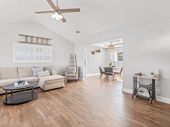 Spending time at home will be the best part of your week! Within walking distance of Kiwanis Park and downtown, this renovated ranch offers great mid-century details and stylish updates. Elevated ceilings, plantation shutters & a metal roof add beauty, value and functionality... and no carpet! The open and roomy living area offers tons of natural light, raised ceilings, a renovated kitchen with quartz, stainless, and loads of counter space. Both baths are fully-renovated, and the en suite primary bath features a privacy barn door. Set on 3 lots of record, this home has a huge yard with extensive new fencing, and a new patio. There's even a covered outdoor storage area for boats, vehicles, and sports toys.