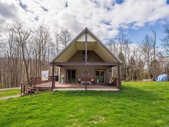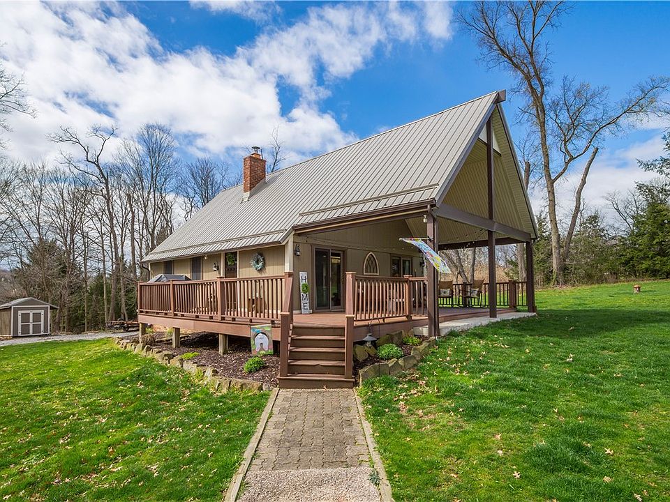 Settlers Glen in Chartiers Twp hosts this magnificent rustic retreat tucked away on 1.7 acres. Mature trees offer beautiful seasonal views.This custom A-frame home is fully updated~Vaulted/beamed ceilings w/gleaming knotty pine floors WOW you!~Dual sliding doors open to the HUGE covered porch~Updated kitchen includes SS appliances, ceramic backsplash, & quartz tops.The center brick fireplace extends the first & second level while the upper level hosts the owner’s bedroom, private bath & loft~currently an office. 2 bedrooms & another full bath complete the main level w/warm wood hues embracing you in comfort. The lower-level opens to the rear yard~w/laundry, mudroom, storage, & tv room all nicely finished~ Bonus flex space of the laundry area could be office or craft room~ whatever fits your lifestyle.A lengthy driveway offers ample parking & a very “sought after” level & private yard ideal for gardening, pets, or playing~you decide~This is your "happy place" to live the way you want!