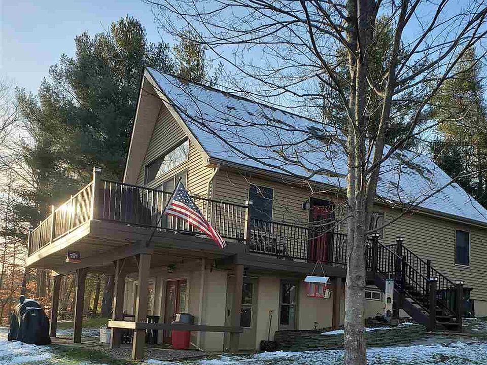 Exiting the city life? Less than 2 hours away you can enjoy rural and quiet Country living that the foothills of the Catskills provide. Offering a special contemporary with a "Welcome" from the sign at the entry, to every nook in this 2 bedroom main level & a large loft style 3rd bedroom with pine ceiling and skylights. The heart of the home is the living room and dining room w/ soaring pine cathedral ceiling and the well laid out kitchen w/ breakfast bar seating, ss appliances, granite counters, pantry and cork floor. Full bath completes this level. Newly installed wrap around deck. The lower level has light and airy family room, featuring a pellet stove that shows the fire, 2 sets of french doors leading to the stone patio w/ the deck above for cover, perfect for summer relaxation, large 1/2 bath w/ laundry. A spacious area for home office/crafting/sewing or an entertainment/bar area to flow from the family room. A back storage room, behind sliding barn doors, and a utility room.