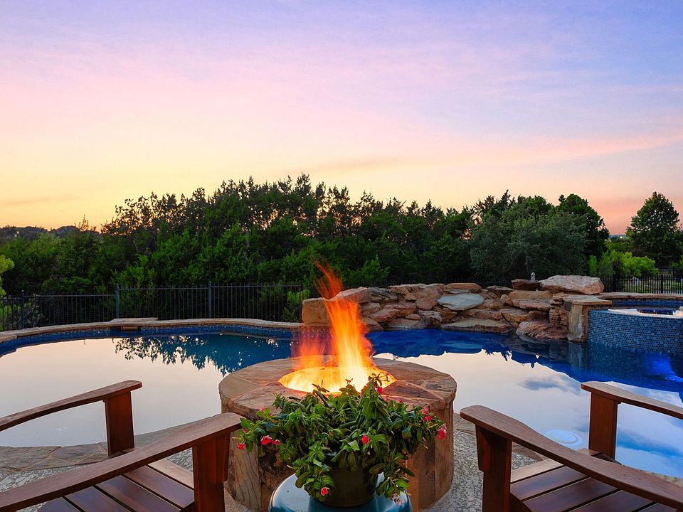 There is no compromise with this home – incredible privacy, outdoor living and playing, and a space for everyone and everything. Located on a private corner lot in Highpointe, with HOA greenbelt behind, on over half an acre, and in the Dripping Springs school district, this location provides both a private haven and convenience to both Austin and Dripping Springs. This back yard is magical- enjoy Hill Country sunsets while relaxing by the firepit, take a swim in the pool, or unwind in the hot tub. Dine al fresco under the great heritage oak tree after preparing a meal at the outdoor kitchen. There’s still plenty of space for play – on the pickleball court or on the beautiful lawns. The home lives like a one-story with four bedrooms and three full bathrooms down; upstairs is a media room and half bathroom. This home would be fantastic for multi-generational living with an office/den that connects to one bedroom and a jack-and-jill floorplan for the other secondary bedrooms. The primary suite is bright and airy, with plantation shutters, a large bathroom with a walk-in shower and a soaking tub, and a generously-sized closet. The heart of the home is the open den/breakfast/kitchen area. The kitchen has warm wood cabinetry with an updated backsplash and hardware and a stylish (coffee) bar. Enjoy lower electric bills with solar panels that significantly offset-electric usage and your electric car is covered in the 3-car garage with an EV charger. Neighborhood amenities include miles of hike and bike trails, a resort style pool, playground, soccer field, basketball and tennis courts, and a fitness center.