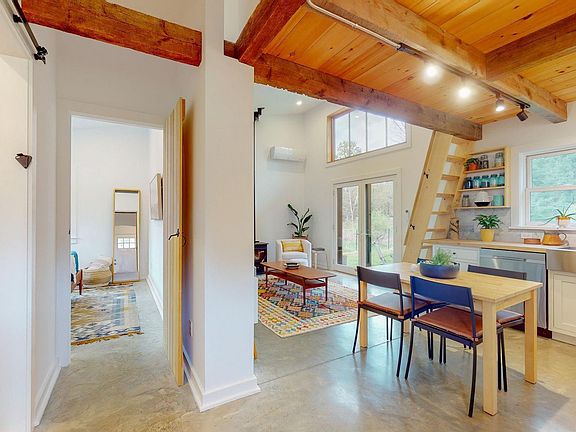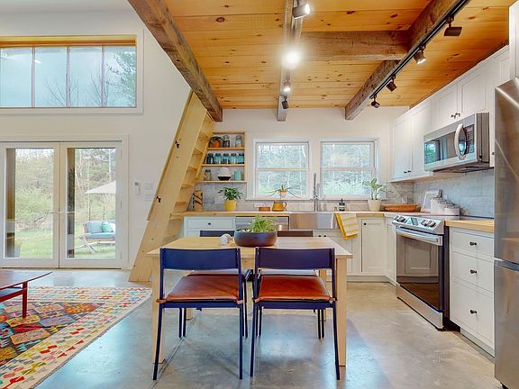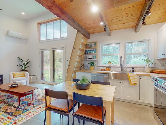 Truly escape from it all in the compact, chalet-style Cedrus Cabin. Set back from a quiet country road, with the Mettacahonts Creek meandering through the property, this minimalist modern abode offers a perfect upstate respite without all the headaches of upkeep. The efficient footprint of this new build offers an open flow living area, and high-end finishes like vaulted ceilings, recessed lighting, polished concrete floors, marble and slate-tiled bathroom, and custom kitchen with stainless steel appliances. Indoor comfort is ensured by spray foam insulation and a fossil-fuel-free combination of electric baseboard heat, wood stove, and ductless mini-split heating and cooling. Soaring ceilings, double glass doors, and an oversized transom window bring in an abundance of natural light, and provide a seamless connection to the unspoiled nature at your doorstep. The 4.5 acre parcel features approximately one acre of fenced meadow at the front of the property, with a wooden footbridge traversing the year-round creek and leading to the wooded back acreage. Additional building sites on the property could be possible with some clearing, and town approval. Nearby outdoor recreation also abounds, with the Vernooy Falls Trail Head (in the 30,000 acre Sundown Wild Forest) just a 4 min drive up the road. Minnewaska State Park is just a 19 min drive, the Ashokan Rail Trail is a 12 min trip, and many of the Catskills "high peaks" are also within close range. Cedrus Cabin is also notably situated amongst other popular upstate destinations, including the renown Hudson Woods development, fan favorite Zink Cabin, and its sister property Cook.house––all within 2 miles. Enjoy dining and mingling at local favorites like Westwind Orchard, Arrowood Farms, INNESS, Rough Cut Brewing, Outpost BBQ, Cherries Ice Cream, Stonehill's Farmhouse, Skate Time, and Mill & Main restaurant and provisions, all less than 20 min away. With both Kingston and Woodstock just 30-40 min away as well, the best of the Catskills are yours to enjoy from your home base at Cedrus Cabin.