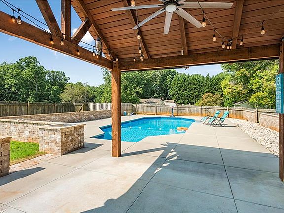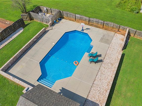 Welcome Home! You'll immediatley be captivated by the charm of the large rocking chair front porch. Step inside to a spacious living room that provides an abundance of natural ight. Kitchen features a large island, pantry and updated stove and dishwasher. Main level primary bedroom with WIC and secodary closet. Primary ensuite with linen closet, dual vanities and a large shower. Upstairs are two generously sized secondary bedrooms each with two closets and a secondary bathroom. Hardwoods on the main level and new carpet upstairs. The unfinished basement holds immense potential to create the space of your dreams. Oversized garage with a large bump out perfect for a gym, workbench or storage. Step outside to the dream backyard. The large pool and deck area are perfect for summer days that last here in NC! The covered pergola adjacent to the pool offers a shaded retreat. This home provides ample storage space to keep your belongings neatly tucked away. This home has it all!