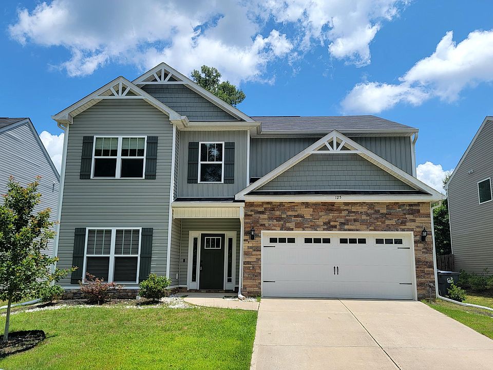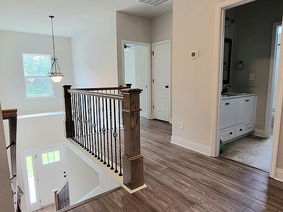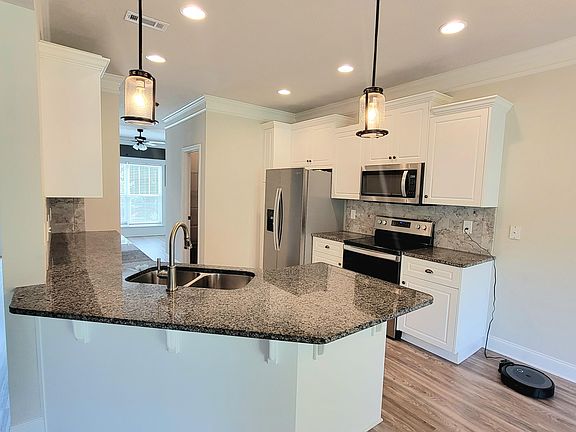 This Beautiful home is back on the market at no fault of the seller! Only 3 yrs. young and reduced to sell! Featuring 5 bedrooms and 3 full bathrooms. Energy efficient home. The kitchen features granite counters, backsplash, large pantry closet and stainless-steel Whirlpool Silverline appliances (Refrigerator Included). Upgraded Luxury vinyl in all of the home. Open floor plan with a spacious great room with laminate hardwoods throughout home. Guest bedroom/in law suite and full bath on main level. Huge owner's suite up with dual closets garden tub, walk in shower, framed mirror, and oil rubbed bronze fixtures. Four spacious bedrooms and additional baths are up! Upstairs, a large open landing strip welcomes you and 4 additional bedrooms. The primary bedroom features his and her closets with lots of space, garden tub with tile surrounding, dual sinks. Three additional bedrooms, a full bath and laundry room finish the upstairs. Sliding glass door leads out onto patio overlooking fenced yard backing up to woods. The neighborhood pond is fully stocked and available for fishing!