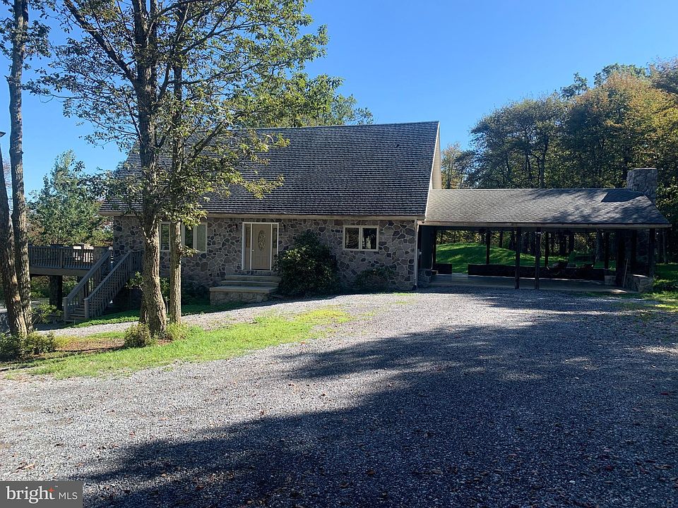 A rare find in the area. Stone/vinyl sided Cape Cod/Chalet that overlooks the Cumberland Valley. 25+ acres surround this private 2-story with partially finished basement. Large front deck with small deck leading to kitchen/living area. Well approximately 450' deep, 2-car attached carport with stone exterior fireplace, sandmound septic system to rear of home, underground electric, buried propane tank near septic system, 4-ton heat-pump 4-5 years old, 1st floor laundry, fireplace in family room and fireplace in lower level game room, Chinese Cherry hardwood floor in family room, loft area overlooks 1st floor and a whole lot more!!!!! PLEASE follow direction or you will end up at the wrong property!!