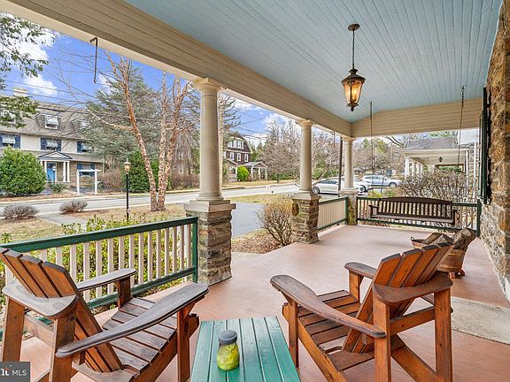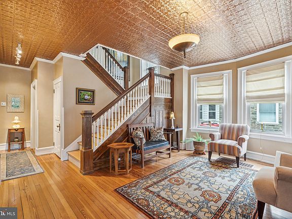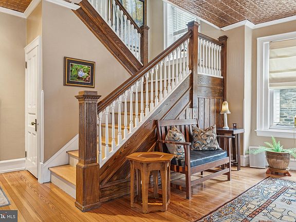 If you are looking for a very spacious home with a lot of character- and a property that is walkable to both the Jenkintown train station and shopping: 125 Township Line Road may be just the place you have been looking for! With a total of six bedrooms and three and a half bathrooms in over 3000 square feet of living space, this home has all the hallmarks of being lovingly maintained and updated over the years. A charming columned front porch leads to the handsome oak front door with custom stained glass transom. The entrance foyer is large enough to have it's own sitting area- and you will fall in love with the beautifully restored paneled oak staircase and pressed tin ceiling. To the left of the foyer is a large living room with beautiful hardwood floors and a gas fireplace with stained oak mantel. Enter the dining room through large original pocket doors: with a sunny bay windowed area and reproduction William Morris wallpaper, the dining room is spacious enough for even the largest of holiday gatherings. A very charming powder room is almost hidden under the main staircase and is perfect for guests. The kitchen with stainless steel appliances and a separate breakfast or tv room with a full bath and access to the back yard complete the main floor. The second floor offers three spacious bedrooms and a full hall bathroom with tub. The third floor has just been renovated and affords three more bedrooms and a brand new bathroom with marble flooring and large walk-in shower- this level could also make a fantastic primary suite of rooms with an office/exercise room and walk in closets. Other important items to mention: the house was completely rewired with a new 200amp electrical panel in 2023, the central air and forced hot air heating systems were replaced in 2018. main roof replaced in 2018, Large dry basement with raised platform for model trains (or maybe children's stage performances?) The back yard is fully fenced with a charming stone wall at the rear, fountain, storage shed, covered pergola, and lots of mature plantings. There are almost too many interesting qualities in this home to list - it must be seen in person to be fully appreciated.