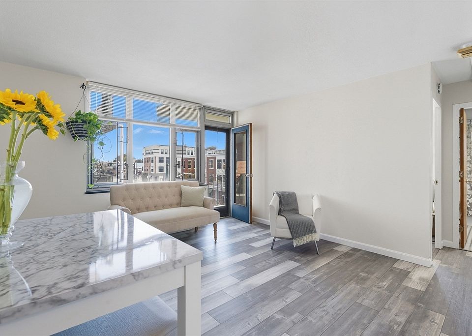 Located in Belmont's vibrant Cushing Sq. this 510 sq. ft. 4th-floor 1-BR, 1-bath unit offers new laminate flooring, an open space concept kitchen/living area opening to a balcony, three in-unit closets offer ample storage, and an additional storage unit in the basement is deeded to the condo. Laundry on the first floor by the elevator pay-by-card (no coins), no in-unit washer/dryer per HOA Rules. Small pets allowed. Bus stop in front of the building to Waverly Sq. & commuter train, across the street in the opposite direction to Harvard Sq. NO DEEDED PARKING SPACE but parking spaces available for rent in the Cushing Village buildings and the gas stations on Common St. Please see "Firm Remarks" section for details on forms that MUST be included in any offer after the NEW MA INSPECTION LAW went into effect on October 15, 2025.