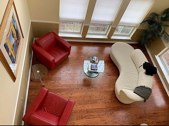 • The two-story living room with floor to ceiling windows offers abundant of natural light.