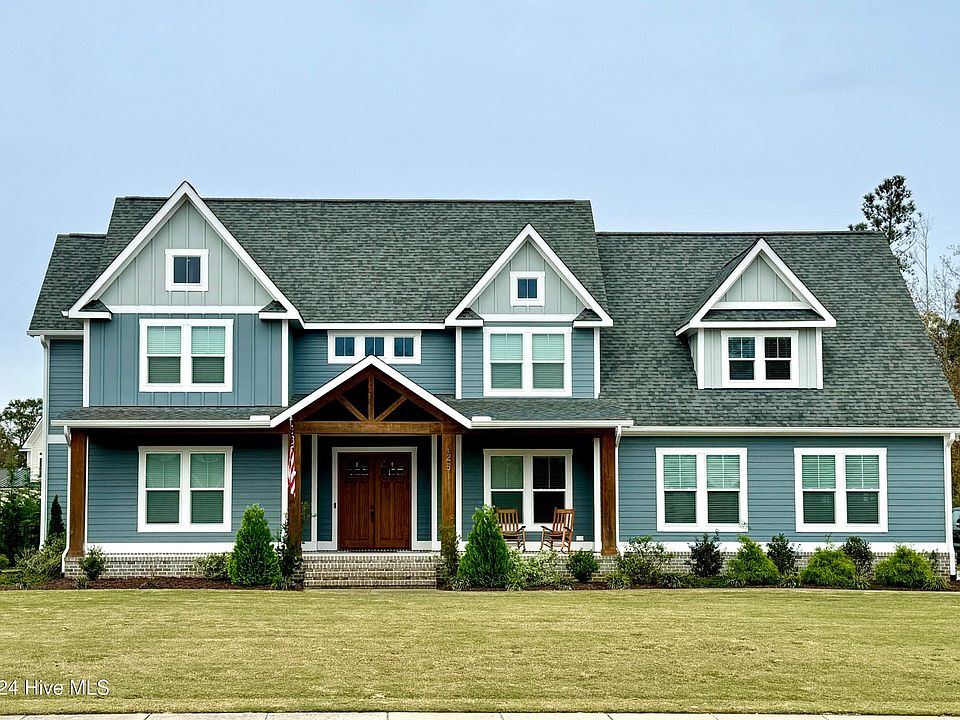 This stunning home combines luxury, comfort, and modern farmhouse charm in every detail. Upon entering, you'll be greeted by exquisite trim work including shiplap wall accents, custom beams, wainscoting, and built-in cabinetry, all thoughtfully crafted to elevate the home's design. The living room boasts vaulted ceilings with beams, a gas fireplace with a stone surround and floating mantle, flanked by floating shelving, shiplap and custom cabinetry, creating a warm and inviting atmosphere. Engineered hardwood flooring runs throughout the main living areas, complemented by designer light fixtures that add elegance and function. The spacious chef's kitchen is equipped with top-of-the-line Samsung stainless appliances, including a 5-burner gas cooktop with a custom hood and double ovens. Granite countertops and a subway tile backsplash create a timeless look, while white custom wood cabinetry with soft-close drawers and doors offers both beauty and practicality. The oversized island with seating and the pot filler add the perfect touch for meal preparation and entertaining. A well-appointed butler's pantry with custom wood shelving ensures plenty of storage space for your kitchen essentials. The master suite serves as a private retreat with an accent wall and a luxurious bath featuring a freestanding soaker tub, a walk-in glass spa shower with a tile floor, dual vanities, and spacious walk-in closets for both him and her. The homes second floor includes three guest bedrooms, a loft, a family room/fifth bedroom, and two full bath. The main level is completed by a private office with built-in cabinetry, shelving, and a shiplap wall. The functional laundry room includes cabinetry, a sink, cubbies, drop zone and custom built-ins for added organization and completes the home's practical spaces. On the exterior, the home boasts low-maintenance Hardi Plank siding and a welcoming front porch with a stained tongue and groove ceiling.