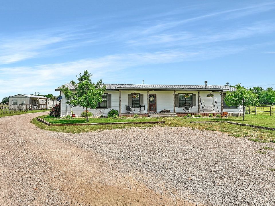 Your very own horse property in a desirable area of North Texas. The main home has beautiful wood detail and a well designed layout. Open kitchen to living makes a welcoming space to gather with a breakfast bar and adjacent eating area. Stainless steel appliances included Don't miss the fireplace to keep you warm on those winter days. Step out onto the covered porch with a fan for circulation that overlooks your acreage. Bring your horses. There is a lighted, open riding track. With 27.9 acres, there is plenty of space to ride. Horse barn includes 4 stalls, tack room, rubber matted floor with the rest as an open shop on a separate electrical meter. 18x40 RV cover and 20 ft storage container are included. Adorable mother-in-law tiny home with 1 bedroom and 1 bath is 560 sq. ft. with a wheelchair ramp. The possibilities for this wonderful property are endless! Country living, but close enough to city conveniences. Call now for your own personal tour.