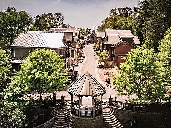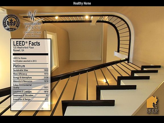 Coveted master on main beauty with a heart for our world. An environmental triumph in construction. Incredible craftsmanship in this special LEED Platinum Certified home located in the heart of Historic Roswell's walking district. Truly a home and community like no other with rainwater irrigation, solar photo voltaics, cutting edge energy efficient features throughout. Amazing interior space that flows effortlessly with four distinct outdoor areas. Open kitchen with cork flooring, granite and stainless appliances. Fireside family room. Master retreat with spa bath and private patio with stone fireplace. Ideal layout for "work from home" options. Upper bedroom level features a second master with covered porch access, two add'l bedroom suites and loft. Plus a spiral staircase leading to studio with half bath. Invite friends and family for fun times in the finished terrace level with wet bar/kitchenette, wine storage, theater room, game room. Gather at neighborhood private park with gazebo and woodland trails to the creek. Peaceful retreat so close to the energy of Canton Street. HOA cares for front lawn maintenance.
