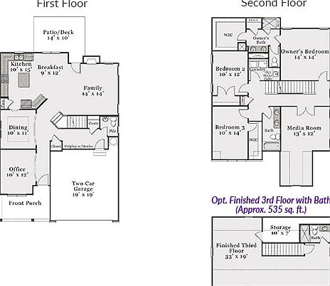 McKee Homes presents the Finley 2020 floorplan featuring an open living layout with a spacious living room, breakfast area, and large gourmet kitchen with island. The Finley has true flex-space on the first level with a formal dining room as well as an office, study, or whatever-you-want-it-to-be room. There is also a mudroom as you walk in from the garage and a rear patio off the family room and breakfast area. The second floor features a private owner's suite with immense walk-in closet, shower with seat, ample linen closet as well as dual-sink vanity. Two additional bedrooms, laundry room and large media room finish out the second floor. The Finley 2020 European elevation features custom exterior details that give these homes a refined upscale look. The blend of architectural stone, siding, and specially styled arches and roof lines give our European Collection homes a unique and appealing design. Options include a garden tub and separate shower in the owner's bath, a walk-in closet in the media room allowing it to be used as a fourth bedroom and optional sink and cabinets in the laundry room. For even more space, the third floor can be finished including a full bath. Additional exterior options include a covered rear porch and sideload or three-car garage depending on lot size and orientation.