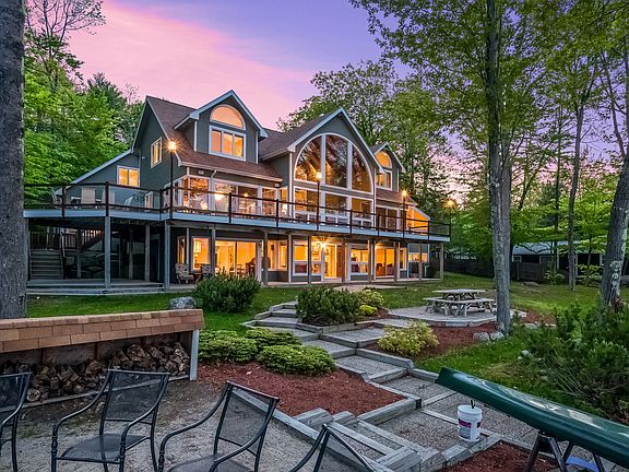 This property must be seen to appreciate the peaceful location and stunning views. -- This home is all about the palladium and corner windows bring in the long lake and mountain views. The quiet bay is perfect for swimming, canoeing and kayaking. The peaceful neighborhood is one of the most charming and elegant neighborhoods on Winnipesaukee. The prime waterfront that Windermere offers is, of course, spectacular!! The central lake location and U-shaped dock will have great appeal to boaters! The outdoor fire pit is perfect for enjoying the spectacular moon rises over the lake. As you enter the home, the palladium windows frame dramatic lake views. Corner windows further enhance these spectacular lake and mountain views. The open concept living, dining and kitchen areas open to a wraparound deck that measures 57' x 12' in the front and 19' x 37' on the side. Also opening to the deck, the first floor master suite shares the pristine lake views. The master suite also has a fireplace and its own sunny office. The upper level has 2 bedroom suites and a sitting room. The lower level offers 2 suites with bathrooms, a laundry, bonus room, and a family room with fireplace. This is a great home for entertaining in a relaxed open concept space. The nearby Windermere Association beach is a great gathering spot for watching sunsets and meeting friends.