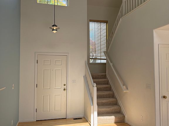 Upper floor has three bedrooms, two full baths and a loft. Main floor has living area with 18-foot ceiling and a fireplace. Powder bath off of the kitchen area. Small basement is partially finished with a 3/4 bath. Two-car garage with auto opener. South-facing large deck in back yard.