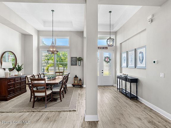 Newly-built in 2022 and still radiating model-home allure, this 3BD + flex space, 3BA gem in the gated Georgiana Reserve blends clean modern style with standout functionality on a 0.36-acre corner lot. The kitchen is a true showstopper, featuring an oversized quartz island, wall oven, floor-to-ceiling soft-close cabinetry, apron sink, and smart storage beneath designer lighting. Double glass-door entry, whole-house plantation shutters & sleek LVP flooring add a refined touch, while the epoxy-coated 3-car garage offers both utility and polish, with the added bonus of overhead storage. The split floor plan provides a private, luxurious primary suite with dual walk-in closets (with organizers), a soaking tub and a walk-in shower. Step seamlessly outside from the primary suite, great room, or breakfast nook to a low-maintenance saltwater pool and an expansive paver deck, set in a high-screen enclosure and surrounded by lush landscaping for privacy. The upgraded landscaping is supported by a whole-yard irrigation system, and a wide side yard with no adjacent neighbor enhances the home's uniqueness and functionality. Ceiling fans throughout, including on the lanai. Enjoy community walking trails and access to two private docks, including one on the Indian River, ideal for fishing or paddle boarding. Nestled in a prime location (no flood zone) between the Indian and Banana Rivers, steps to scenic Tropical Trail and just minutes to the beach, Port Canaveral, and fine shopping and dining - under an hour to Orlando International Airport.