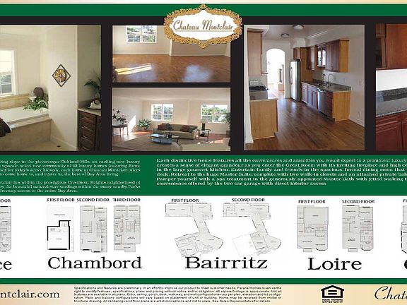 This is your opportunity to come home to, and rejoice in, the best of the Bay Area living. Located just above Highway 13, Chateau Montclair lies within the prestigious Crestmont Heights neighborhood of the Oakland Hills. This area offers the opportunity to enjoy the beautiful natural surroundings within the many nearby Parks and expansive Open Spaces and yet offers easy freeway access to the entire Bay Area. The quaint and charming Montclair Village is just minutes away. Experience the friendly old time, small town feel while exploring the many unique and independent businesses the upscale Montclair Village offers. Taking its name and inspiration from this charming oasis, Chateau Montclair is its own modern day refuge. Each home features the conveniences and amenities you would expect in a prominent luxury community. Combining European grace with California grandeur in an elegant new community, Chateau Montclair offers a world of cultured opportunity. Dine, play, shop, and live at Chateau Montclair centered in an atmosphere of distinction. Call about our buyer incentives.