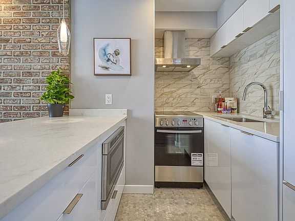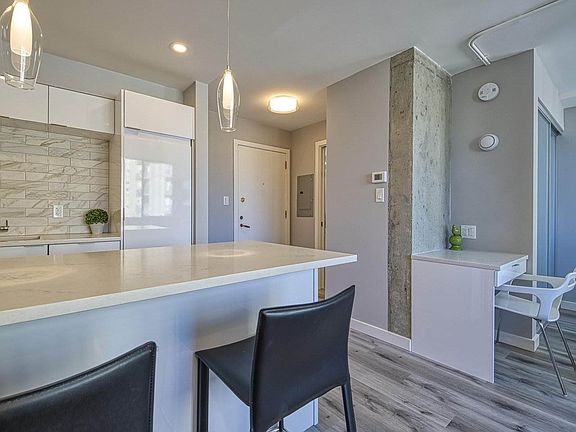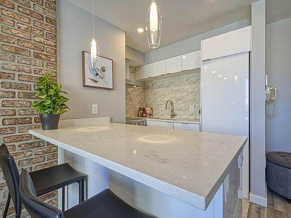 Personal Oasis in the West End. Jr 1 bedroom suite that has been completely renovated in gorgeous detail. Kitchen is outfitted with marbled white quartz counters including a breakfast bar and decorative back splash. St/St apps including stove, dw, wall mount hood fan and microwave drawer nestled in the island. High gloss cabinetry and matching high gloss fridge. Radiant in floor heating in the kitchen and bathroom below ceramic penny tiled flooring. Feature brick wall in the living area adds to the character. Huge windows allow tons of natural light. 43'' swivel TV built into partition wall. Parking and Storage can be rented from mgt. Pre-paid Leasehold non-Strata, Rentals are OK. Shared Rooftop deck with Pool and million dollar water views!