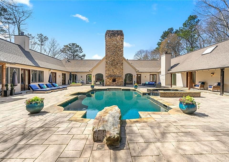 Gated sanctuary wrapped within 4.5+/- acres in Buckhead! Wind your way through a tranquil, wooded property to an elevated and secluded house. Embodiment of one floor designed living, the house orients each oversized and light-filled living space with direct access and views to centralized outdoor space featuring: 4500 sqft patio, outside kitchen with pizza oven, pool, pool house, hot tub and gazebo. Enter the central wing through grand porte-cochere into a dramatic foyer and breathtaking living room with peaked 26 ft tongue/groove ceiling and majestic stone fireplace. Entertainer’s dream wing features a completely renovated kitchen with custom oak cabinetry, Calcutta Gold quartz island and matching countertops, two dishwashers, Wolf range, Subzero refrigerator and two full size wine refrigerators. This wing extends through the keeping room, with fireplace, into the peaked sunroom. Accordion doors then link the outdoor kitchen and external living room space to the entertainment wing. Expansive primary suite wing of the house includes private access to secluded outdoor retreat with fire feature. Renovated primary bath with dual vanities, separate tub and shower and large walk-in closet. Every bedroom boasts renovated ensuite bathrooms with pool house available as an optional nanny suite with separate entrance and full kitchen. The house uniquely combines indoor/outdoor living with the essence of the unparalleled property. Move in ready with over a million dollars of renovations.