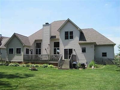 Wagner Hills Wonder! Super sited on .42 Acre lot, this gracious home takes advantage of the wooded back drop. Amenity packed, thoughtfully designed, Stunning two story stone fireplace graces the great room and is flanked by sizeable windows. Upgraded walnut hardwood flooring, fluted oak trim with rosettes, solid wood doors, & custom light fixtures make a statement as to the high quality construction in every detail. The kitchen is a chef's delight featuring custom maple cabinetry, granite countertops, GE appliances and a zoned wine cooler. Spacious main floor master suite showcases tray ceiling, jetted tub, separate shower, dual vanities & huge closet plus it's own retreat, an all season sun room! Upstairs are three bedrooms & a full bath. Basement is beautifully finished with rec. room, large bedroom, bathroom & loads of storage. Home features 93% efficiency furnace, 5 zone irrigation system, security system & extra large 3 car garage.