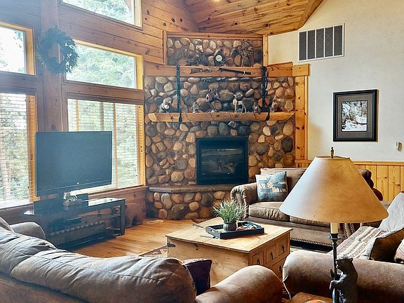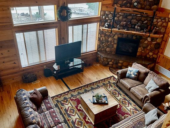 Come see this majestic Duck Creek Pines cabin retreat on a .71 wooded lot with towering pines! This 5 bedroom, 3.5 bath Whisper Creek log home has 3,750 sq. ft. on three levels. The master suite on the main level features a cozy river rock fireplace along with French doors opening to a private covered deck. The 5-piece master bath has travertine counters, a jetted tub, tiled walk-in shower, two sinks, and access to the master walk-in closet with a private washer and dryer. The spacious, upgraded kitchen has stainless steel appliances, a large granite breakfast counter, and a dining area. The open living room has soaring vaulted ceilings, wood floors, a rock fireplace, large windows to take in the forest views, and access to the large covered wrap around deck . The lower level features a game room, two bedrooms, a full bathroom, and laundry room. Log stairs lead up to the family area on the open loft upstairs where you will find another two bedrooms and a full bathroom. The home can sleep 16. There is a 625 sq. ft. attached. garage . Most furniture/furnishings is negotiable on separate bill of sale. The 1.58 acre lot directly behind the property is available for sale..