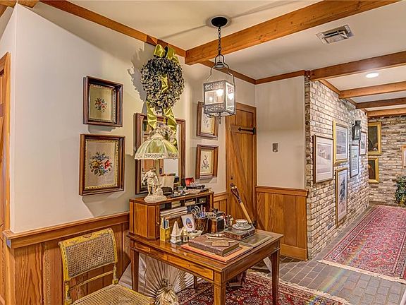 With over 7 acres, this large and spacious ranch-style home provides a unique opportunity to create your own country oasis. Its one-of-a-kind character is evident the moment you step inside. The rich wormy chestnut walls, extensive brick walls and floors create an inviting atmosphere that's found nowhere else. Unique forged lighting adds to the home's unmistakable personality. This home is a magnificent canvas for applying your own touch and vision to the timeless architecture. The grounds include a stream, garden space, and offer an exceptional backdrop for entertaining and garden parties. The multipurpose workshop with double garage below provides ample space for cars/hobbies/projects. This property offers a lifestyle that is both secluded and convenient, providing the perfect balance of rural living and accessibility. Its rare, handcrafted details and ample land make it a truly special find for the buyer with an eye for potential. Additional room for a 4th bedroom.