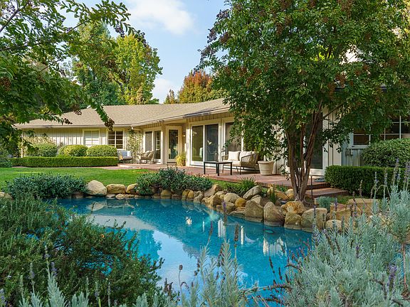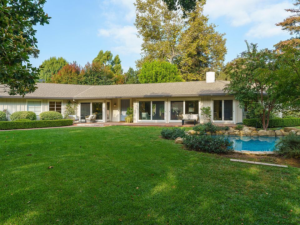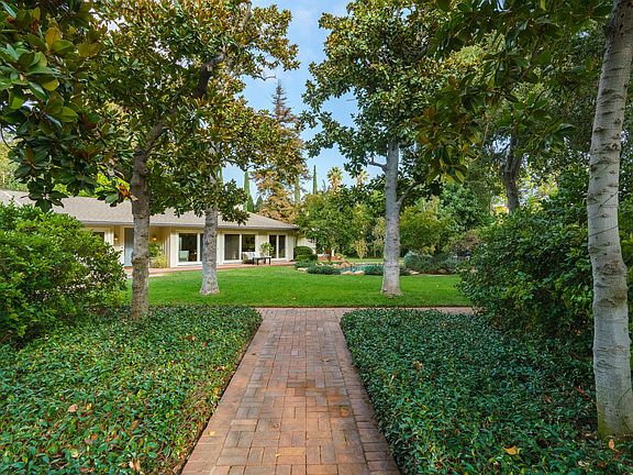 This single-level California mid-century ranch style home is situated in a prime Southwest Pasadena location on a nearly half acre flat lot distinguished by mature trees and well-manicured landscaping. Gated, hedged and fenced on all sides, this contemporary home was originally constructed in 1949 for Harrison Chandler and is beautifully sited on a corner lot. Offering 4 bedrooms and 3 baths with over 3,000 interior square feet of living space, the common areas feature lofted ceilings and sliding glass door passageways which open to multiple outdoor garden and entertaining spaces. The large kitchen features an eat-in bar, a stainless suite of chef's appliances and an adjacent full dining area. The bright interior offers contemporary elegance with clean lines. High quality finishes and fixtures are consistent throughout. Brick garden pathways meander through the property, accented by Magnolia, oak and redwood trees. The swimming pool integrates into the garden setting by implementing stone and shrubbery as a transition to the sprawling lawns. A pool house/casita is an ideal home office or guest retreat offering a bonus 295 square feet with a bathroom.