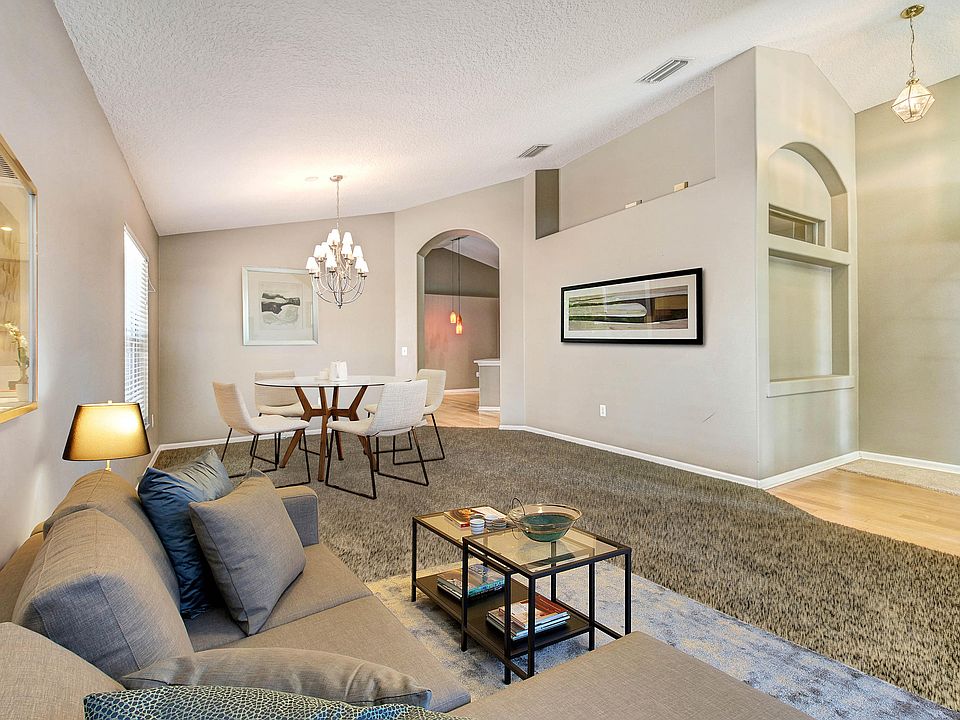3 bedroom, 2 bath home, with an open floor plan Soaring ceilings coupled with this versatile floor plan make it a perfect place to call home. Have a huge living room up front and large dining room off the kitchen or have a living/dining room combo with a family room and breakfast nook off the kitchen. Even has an AC carpeted Florida room, lots of different options for your family. White cabinets in the kitchen set off the black appliances. Brand new roof, brand new range and microwave. A/C isless than 2 years old and the water heater is 2 years old. Lawn care is in included in the front yard.