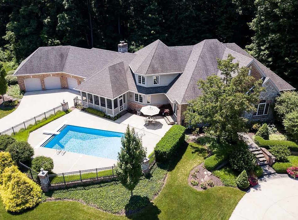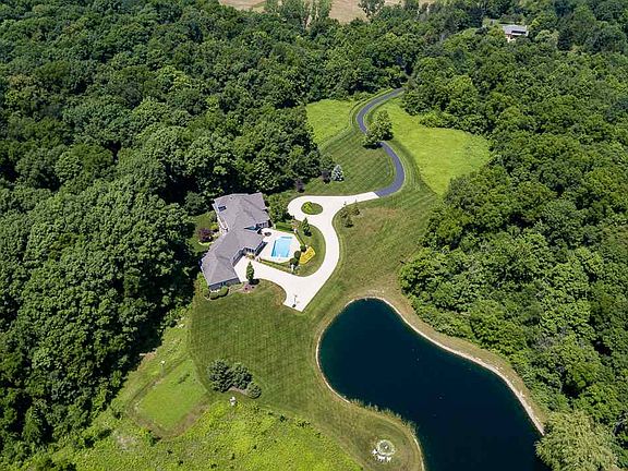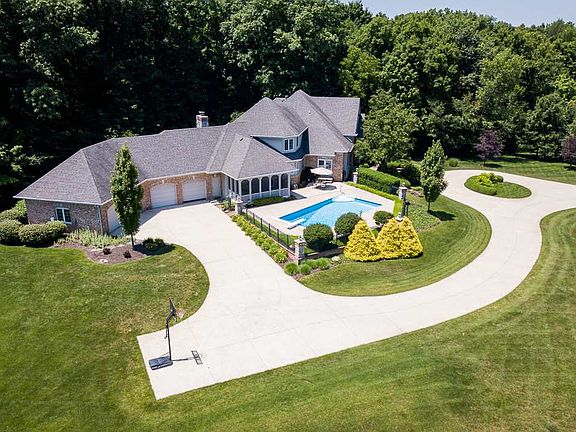 "What do you want to do today?" That was the question they'd ask each other, clutching mugs of coffee on the poolside porch as sunlight kissed the Indiana countryside. With over 16 acres of land and 6,500+ sq ft of home, their options seemed endless. Perhaps they'd take a dip in the below-ground pool, go fishing in the shared two-acre pond, walk the gardens, hike the groomed one-mile path through the woods, or light the fire pit and set up some lawn games. Or perhaps it was more of an "indoor" day. She'd get work done in the lower level office while he hit up the exercise room. Later they'd have guests over for wine and conversation, letting things flow from their open concept dining and entertaining area to their hearth room where a wood-burning Indiana limestone fireplace offered the perfect backdrop. Every day was different. Every day was an adventure. But they always ended things on the veranda overlooking the woods. Home details: 16.4 acres; 6,520 sq. ft.; Chris Stauffer home; 5 BR; 4 full and 3 half baths with 2 master ensuites; additional 13.28 acres available; open concept; eat-in kitchen with granite countertops, Grabill cherry cabinets, GE Monogram appliances, Bosch dishwasher, large pantry, and view of the pool; main floor birch hardwood floors, Pella windows, Royal red onyx gas fireplace, rip rap and Ind. limestone woodburning fireplace with gas starter in hearth room, 9' ceilings, formal dining room, den, screened-in porch, veranda with view of woods; main floor master suite has dual shower heads, double sinks, extra-large closet, veranda access; upper level has second master suite; Jack & Jill bathroom with private sink/closet area, walk-in attic storage; lower level has kitchenette, office/playroom with cork flooring, full bath, exercise room/5th bedroom, 2 large storage areas, walkout to patio; 17' x 34' pool with retractable cover, mature trees, 2-acre shared pond, irrigation system, 35' x 45' garden area with irrigation, groomed path through woods, fire pit, circular drive; extra deep four-plus bay garage with NEMA 14-50 240V electric car charging plug & access to lower level storage; mechanicals include dual furnaces, humidifier, septic/well pump, new well tank, water softener; SACS