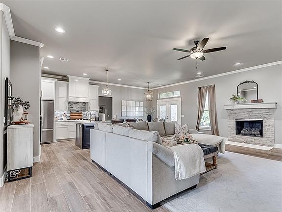 **Gated neighborhood contemporary masterpiece effortlessly combines modern design with utmost comfort inside an open-concept layout. The spacious living areas are perfect for entertaining guests or unwinding with family. Enjoy the features of the tankless hot water tank, attic decked with a 4ft walkway, tray ceilings, crown molding throughout, 28+ sprinkler heads, 21ft deep garage, and hard-wired internet all through the home. Pocket doors, sliding wood doors, and a backyard of solitude with a built-in exterior wall fireplace for Oklahoma Cool nights! Don't delay, schedule your appointment today!