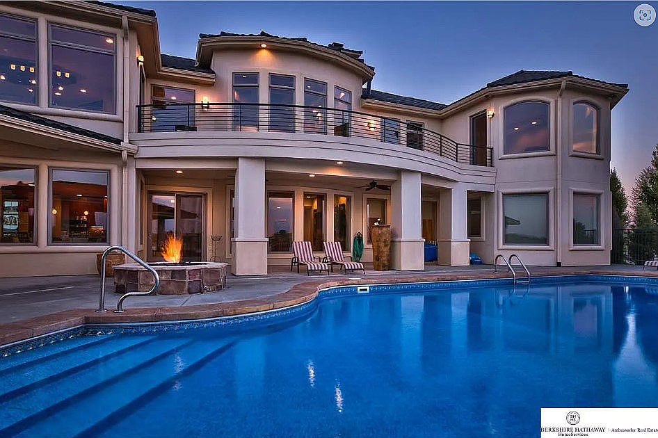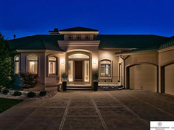 An Entertainers Dream LAKE Home with Breath-taking lake views & Sunrise/sunsets from every window! Strikingly Beautiful Ranch Walk-out home on prime Newport Landing point lot. 4 Bed, 6 bath, 5 car garage (4 up + 1 Lower drive around), golf simulator, 5 fireplaces, Travertine floors, iron rails, automatic shades, deluxe sound system inside and out, home office, exercise room, grand master suite with fireplace, oversized walk-in closet & access to upper balcony. Elaborate resort style outdoor areas complete with: custom swimming pool, hidden grill, pool cabana, top of the line stationary platform dock. Newport Landing on Bennington Lake is a deep NRD Flood Control Man made Lake (No Flooding) - allowing full wake boats, jet-ski's and fantastic fishing! Recently updated kitchen, bathrooms, carpet, paint (inside and outside), HVAC systems, landscaping, pool liner, heater and pump and much more.