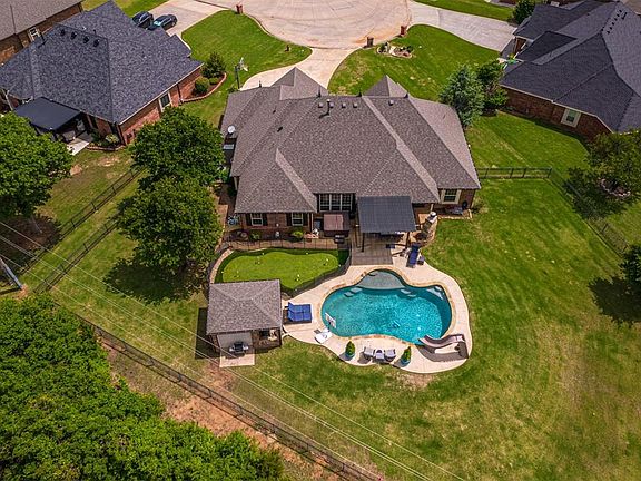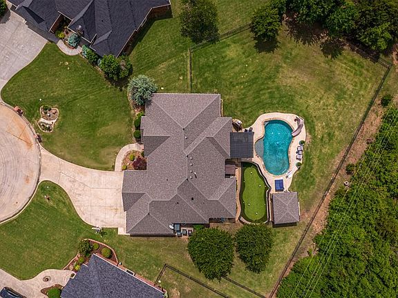 Welcome to your new home located in the gated community of Forest Glen. This neighborhood offers a manicured fishing pond and paved walking trails. This home sits on .38 acres with an iron lined fence that backs up to a greenbelt giving you a taste of serenity, but conveniently located close to Tinker AFB and I-40 access. The home located at the top of the street draws you in with its mature landscaping and lush yard. Upon entering... the open floor plan, floor to ceiling windows, brick fireplace, hardwood floors, and views of the outside oasis capture your attention. The kitchen, that overlooks the living area, features granite countertops, stainless steel appliances and accommodating island seating. A huge double door walk in pantry catches all your home needs. The laundry room has its own sink, plenty of storage and a folding countertop and access to your spacious 3 car garage with an inground storm shelter. The primary suite has a large bathroom featuring double sinks, a jetted whirlpool tub, and a great walk-in closet. The split floor plan and secondary bedrooms are separated by a hall-way bathroom. The rooms are plenty spacious to fit queen and king size beds with amazing closet space. This home is ready for entertaining or to be your personal resort. The backyard ...THE BACKYARD WOW! The pool, outdoor fireplace, covered patio plus a pergola, cabana, and the putting green create the perfect entertaining space. Whether you want to take a swim in the gunite pool, relax by the outdoor fireplace, or practice your short game on your very own putting green... There's no need to ever leave home again !!!