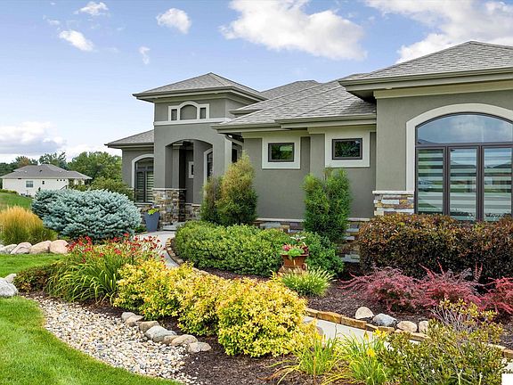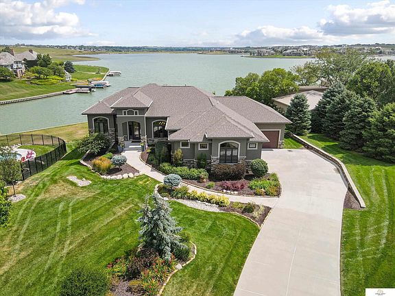 Subject to 48 hour first right of refusal. Absolute divine lake life with year round tranquility, views to downtown Omaha, fishing and boating joy! A walkout ranch was designed with only the best features. Enter to find 10 to 14’ ceilings, arched doorways, formal dining room, and unique custom ceiling details. Superb kitchen with a large island, soft close drawers & doors, 5 burner cooktop, hidden outlets, walk-in pantry, wine bar and more. 2 Primary Suites on the main level. All new interior paint in 2022 and new carpeting August 2022. This pristine setting is perfect for entertaining! The walkout lower level offers a huge bar area/kitchenette, family room, game room, fireplace, additional bedrooms and 2 more baths. The boat dock and lift included! A 2nd patio sets perfectly at the waters edge. Covered composite deck with glass walls for unobstructed views, gas line and hose bib. Oversized heated garage with floor drain and hose bib. Low utilities.OPPD/MUD $411 month!