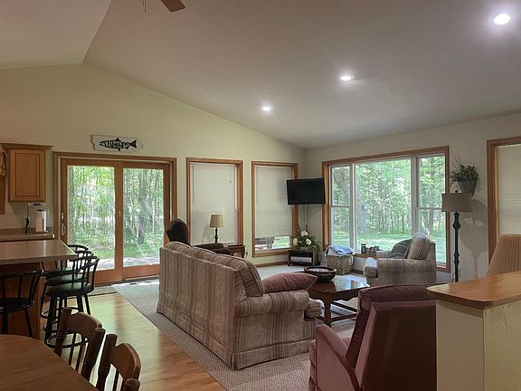 It’s all here! Log-sided home set on 1 ¼ acres of wooded privacy, within a short walking distance to your private association access to full rec Chute Pond. The lake lot offers over 200’ of shoreline with docks and boat launch area plus park-like grounds to gather. If you prefer to hit the trails, the club maintained RR grade is easily accessible. An open floorplan allows views from all angles through expansive windows, cozy heat from a wood burning stove fireplace when needed, and plenty of seating space for guests. Comes completely furnished for turnkey convenience. The full basement is stubbed for a second bathroom - ready to go and even has the materials on hand to get started with an extra room if needed! 12x14storage shed includes yard equipment. This home is a gem!