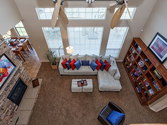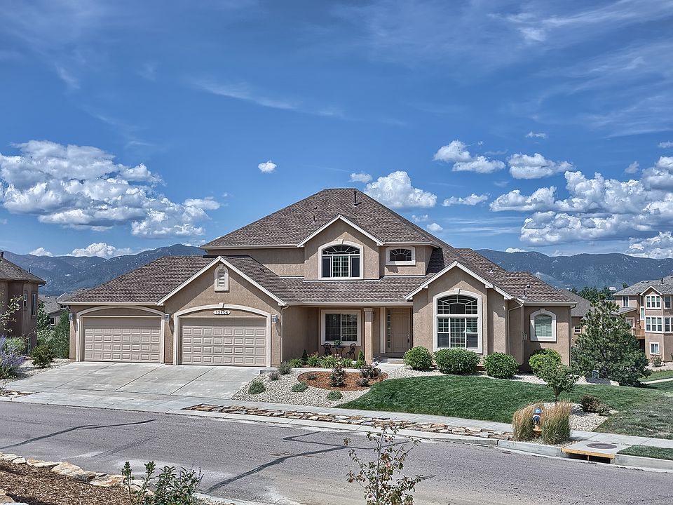 Outstanding location within desirable Stone Crossing. Back and side of house to common areas, full stunning VIEWS of AFA, pond, Peak & mountains. 4 car garage is heated, insulated, hot and cold water, wired for TV. Main Level master w/ 2 sided fpl to BR and bath. Finished w/o bsmt w/wet bar, fpl, exercise, storage, two BRs, one 4 pc and one half bath. Upstairs loft/fam rm, 2 large BRs each w/private bath and w/in closet. Mn Lvl study w/fpl. Stunning kitchen has granite, stainless, 2x wall ovens, 5-burner gas stove. Enjoy our beautiful Colorado evenings on the large Trex deck stubbed for your gas grill, while looking at the AFA chapel framed against amazing front range and Pikes Peak. Drive straight across Northgate to the AFA or walk! Stone Crossing has walking paths throughout that lead across the highway to the Sante Fe Trail and the Academy. This stucco home boasts a new roof (2013) and beautiful landscaping. The gourmet kitchen is all you are looking for to include granite counters, hickory cabinets with crown moldings, walk-in pantry plus butler's pantry/dry bar, island with breakfast bar seating and sunny nook. Eat your cereal while enjoying those amazing, unobstructed views. Double ovens, french refrigerator & 5-burner gas cooktop, all in stainless, make for easy meal preparation. Great room has double sided fireplace w/ one side in the kitchen and floor-to-ceiling stone surround in the great room. 20' ceilings and a wall of windows accents this gathering room in the center of the house. Outside the walk-out basement doors is a patio pre-wired for hot tub. Exercise rm w/ padded floor (carpet available). 2 A/C units, 2 furnaces, 2 50-gal water heaters. Iron railing spindles. Lots of windows for a bright home. Be sure to see this stunning home!!
