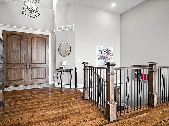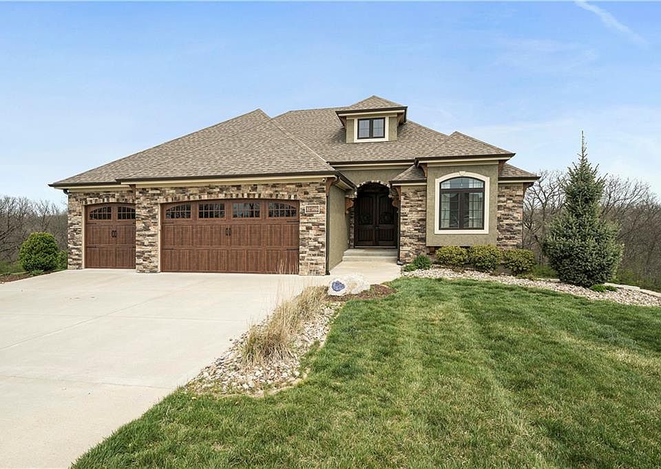 Walk into your exclusive hideaway through the grand double doors and be greeted by a spacious main living area boasting huge windows and a majestic stone fireplace.  The dreamy chef's kitchen and a picture perfect dining spot complete the great room-kitchen combo. The luxurious primary suite offers serene bedroom views, fully tiled shower and walk-in closet. Finishing off the main level is a secondary bedroom with a reading window under a vaulted ceiling. Downstairs is a treasure trove with two more bedrooms, a shared jack-and-jill bath, a trendy wet bar, sleek flooring, and a handy half bath in the family room. Don't miss the extra storage and charming garden room in this elegant abode. Step outside to over an acre of land where you can delight in private vistas, chill on the covered deck, gather around the firepit on the patio, and roam the grounds. This beauty comes with a sprinkler system, invisible fence, epoxy garage flooring, direct propane bbq grill hookup on deck, garage-to-pantry pass through with top-notch Kearney Schools, and a sweet location just north of Liberty.