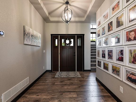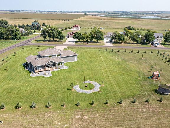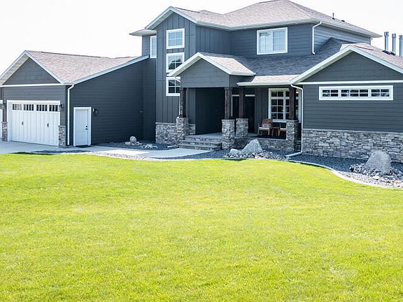 This beautiful two-story custom 6 bedroom + office and 5 bath home is surrounded by evergreen trees on 1.8 acres just minutes east of Bismarck! The house boasts a timeless charm with its west exterior windows tint, LP Smart Siding, and covered front porch. With over 4700 finished sq feet there will be plenty of room for everyone whether you are entertaining or just enjoying your new home. The floor to ceiling Stone fireplace will catch your eye as you enter the home, from there you will notice the kitchen with gas stove, custom knotty alder cabinets, granite countertops, and let's not forget the hidden walk-in pantry! Plus, there is plenty of room for a large dining table right next to the kitchen. The main floor laundry room with custom cabinets, sink, included washer/dryer, and one of a kind built-in dog kennel is located off the primary bedroom suite! The primary bedroom suite offers a stone fireplace, custom walk-in tile shower that includes two heads, soaker tub, heated floors, dual sinks, separate stool area, huge walk-in closet, and frosted French doors to the covered deck that makes it the perfect retreat! The office, ½ bath, and mudroom off the garage complete the main floor. The upper level features a study area and THREE bedrooms, which includes the 2 kid's bedrooms with a Jack & Jill bathroom and additional on-suite. Both bathrooms include granite countertops and dual sinks. In the basement you will be wowed with the family room that has another custom stone fireplace, plenty of entertaining room with a wet bar area, and a separate theater room which features 7.1 Dolby surround, 3D projector, and LED screen. There are 2 more bedrooms, a full bath, and a large storage room. The home is also equipped with numerous smart home features for you to enjoy! The yard includes a sprinkler system, 140' well, and firepit area to enjoy the great outdoors! The 1200 sq ft garage is finished/heated as well! So much more to this property. Don't miss this opportunity to live in the desirable rural Bismarck location!