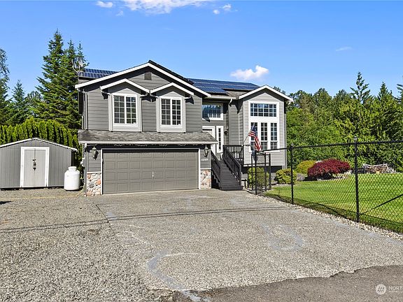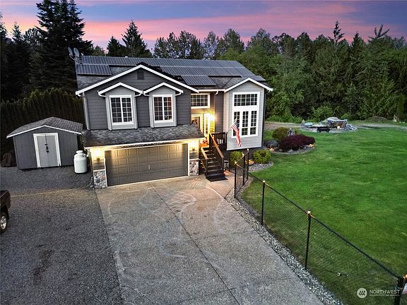 Amazing opportunity to make this to make this beautiful home your own. Upon entry you will find a foyer area & living room w/ gas fireplace that keeps the area toasty warm on NW evenings. Considerably sized primary bedroom & 2 additional bedrooms upstairs along w/ spacious kitchen & dining room. Layout is great for entertaining, or just hanging out. Downstairs is 4th bedroom & rec room perfect for gaming or a workout area. Windows are covered in heat control film to keep the house cool inside, even in direct sunlight. Over an acre of usable flat yard, & 1 1/2 more of protected growth w/ trails to enjoy nature. RV parking & 12x16 pass through shed. Expansive multi-level deck w/ hot tub. Security system. Easy to Arlington or Granite Falls
