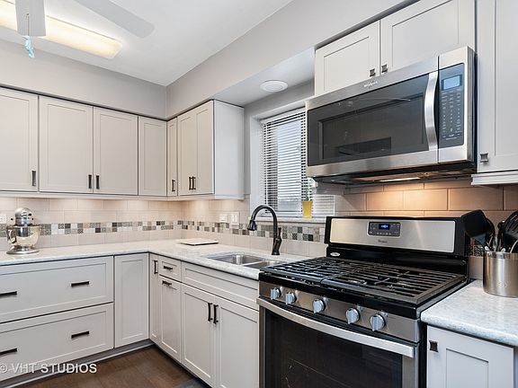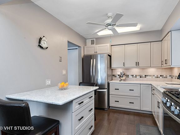 FABULOUS remodeled 2 bed/2 bath condo on second floor quiet building~An absolute must see~ The kitchen is straight out of a Pottery Barn Catalogue! The owners spared no expense to renovate condo~raised ceiling height in the kitchen & took down a 1/2 wall to open up the space. Added engineered hardwood floors, fresh gray paint, gourmet kitchen with quartz countertops, large eat in breakfast bar, top of the line gray shaker style cabinetry with soft close large pull out drawers, custom backsplash with under counter lighting, added windowsill ledge, custom lighting & all stainless steel top of the line appliances. New Furnace & A/C in 2017. Nest thermometer ~ 1 exterior space & private garage. Extra storage space on private balcony. So close to Prairie Path entrance- path takes you to downtown Naperville in minutes and extends all through Geneva and St. Charles. Attends award winning district 203 schools~ Naperville North HS. Don't miss this one! Complex does not allow rentals~
