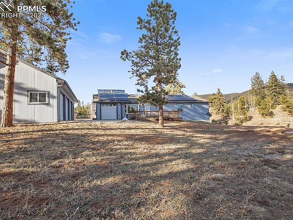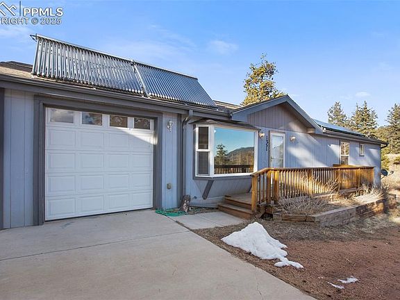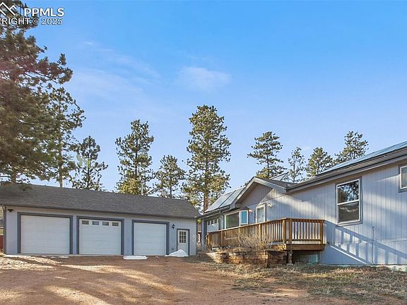 Charming ranch-style home with a full, unfinished basement—ready for your personal touch! Located at the end of a cul-de-sac with great southern exposure and Pikes Peak view. This home features 3 spacious bedrooms, 2 bathrooms, an attached one-car garage, and a detached two-car garage with a workshop and 1/2 bath. Additional amenities include solar panels, well water, septic system, and RV parking. The interior has hickory floors in the living room, kitchen, and hallways, with a bay window in the living room that lets in plenty of natural light. The large, eat-in kitchen is equipped with newer appliances and opens onto a massive deck, perfect for BBQing and entertaining. The master bedroom includes a 5-piece en-suite bathroom. The unfinished basement has its own separate entrance and offers great potential for a second living space. 2 more bedrooms and potential 3rd bath. Solar panels are not hooked up at this time. Some building materials are already on-site for your convenience. The lot is fully usable, and the location is close to all amenities. As a resident of Woodland Park, you'll enjoy access to community events, parks, and a friendly neighborhood atmosphere. Easy to show—schedule your tour today!