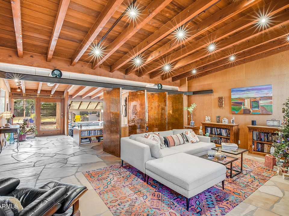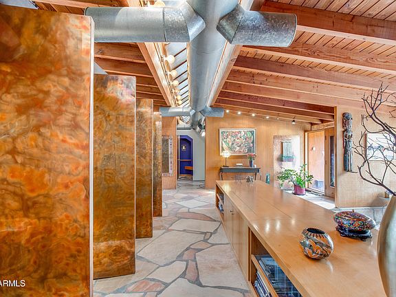 This amazing North Central home on 1/3 acre, designed by well known architect Will Bruder, includes many of his unique touches such as exposed stainless duct work, flagstone floors, vaulted ceilings, swiveled copper panels, one of a kind bathrooms plus natural wood exterior and interior finishes. Exterior provides irrigated natural grass in both front and back, flagstone patio, beehive fireplace, dining and patio seating as well as mature trees and landscape plus above ground hot tub and storage shed. East side of home was remodeled into a primary suite with bath, closet and laundry and features gorgeous porcelain tile floors, 6' modern farmhouse reclaimed pine vanity with cement counters and a custom tiled floor to ceiling tiled shower with frameless glass surrounds. New roof in 2024! tiled floor to ceiling shower with frameless glass surrounds.