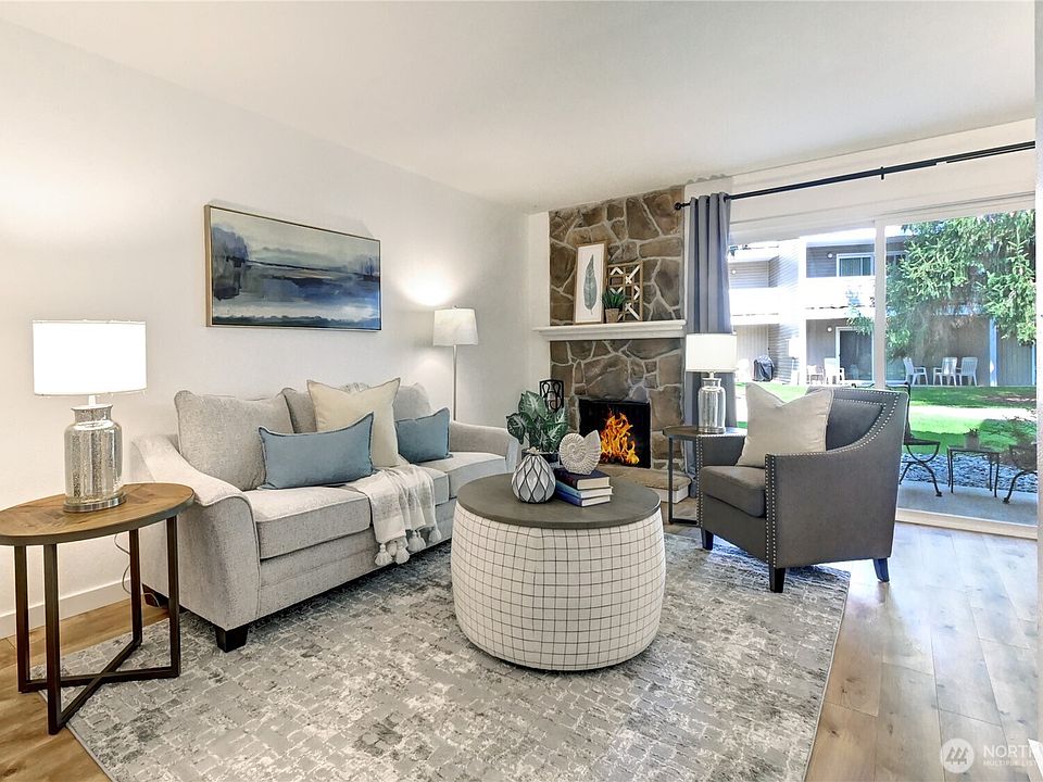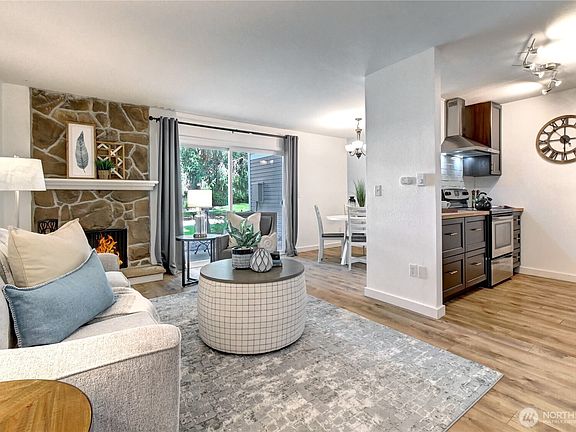 Updated easy access ground floor condo in Kirkland is move-in ready! Unbeatable convenience, just steps to Evergreen Hospital & everything The Village at Totem Lake has to offer. Open floor plan w/engineered oak hardwoods. Modern kitchen w/butcher block countertops, contemporary cabinets, SS appliances, modern light fixtures & farmhouse sink. Updated bathroom w/rustic vanity. Newer craftsman-style doors and millwork. Spacious bedroom with a large custom walk-in closet. Living and dining room open out to a private covered patio that steps out to the lawn. Wood-burning fireplace. Huge pantry. Amenities include community clubhouse, pool, sauna, hot tub & game room, gym and EV chargers. Minutes to I-405 and transit and trails. NO RENTAL CAP!