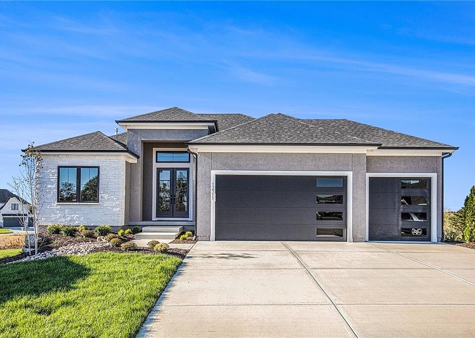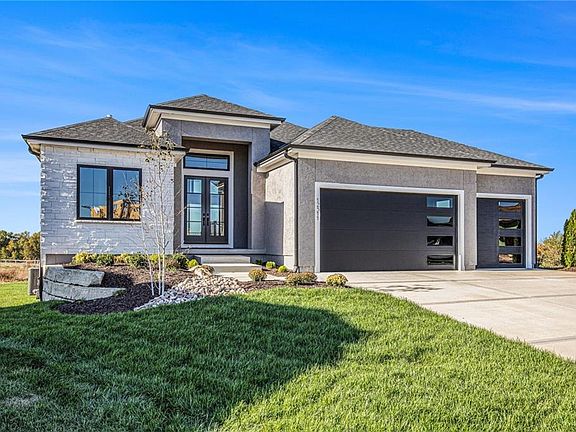 MOVE IN READY -- "The Bayberry I" by JFE Construction located on Lot 90 is a 4 bed, 3 bath Reverse 1 ½ Story. From the moment you walk-thru the 8' double doors you will be amazed. The great room with a vaulted ceiling, floor to ceiling fireplace, and a wall of windows provides a spacious open feeling. Large slider doors from the great room expands your entertainment space to the covered deck w/stone fireplace. Kitchen boasts a large island with quartz tops, stainless appliances, and a large pantry with built in coffee bar. Primary ensuite includes a free-standing soaker tub, double bowl vanity, zero entry shower and walk-in closet. 2nd bedroom or office on the main. The finished lower level includes a family room, wet bar with island, and 2 additional bedrooms and a full bath. Minutes from Blue Valley K-12 schools. Photos include a rendering of the Bayberry. The final home may vary. Any additional photos show the current state of the actual home. Taxes are estimated. Models Open Daily, 11 am – 5pm, and Sunday, 12-5pm. Visit the sales office at 12411 W 183rd Terrace, Overland Park. THIS HOME IS MOVE IN READY.