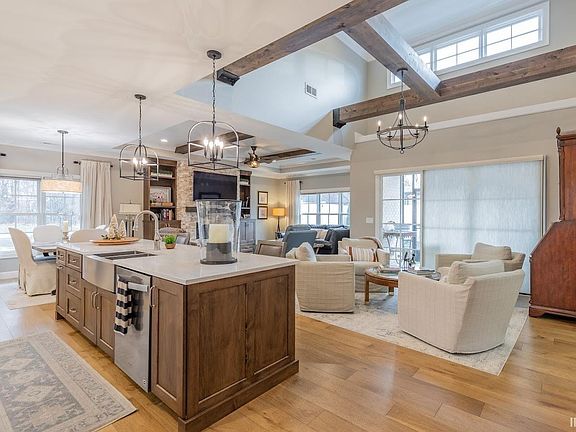 - 1st Bdrm En Suite, Bar, Bookcases, Ceiling-9+, Cathedral Ceiling(s), Tray Ceiling(s), Ceiling Fan(s), Beamed Ceilings, Vaulted Ceiling(s), Walk-In Closet(s), Stone Counters, Crown Molding, Eat-in Kitchen, Entrance Foyer, Soaking Tub, Guest Quarters, Kitchen Island, Natural Woodwork, Open Floorplan, Pantry, Split Br Floor Plan, Double Vanity, Tub and Separate Shower, Tub/Shower Combination, Formal Dining Room, Great Room