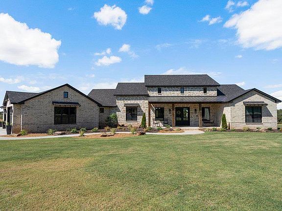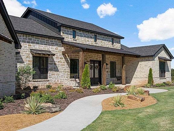 The heart of luxurious Texas Hill Country Style is captured in this splendid MooreMaker Homes Custom Design offering over 11 acres of wide open spaces and conveniently located just minutes from Stillwater or Highway 33 for easy access to Oklahoma City. Hill Country comfort and authenticity begins as you arrive to a welcoming wide front porch and sculpted landscaping featuring large boulders and southwest plantings. The gallery entrance perfectly frames this easy flow, open floor plan boasting reclaimed, wood beams dating back to the early 1900’s. Grand scale meets alluring comfort in the shared living/dining area featuring a cathedral ceiling, tall dormers, 2-story brick fireplace, chandelier lighting designs, and luxury vinyl plank flooring. A masonry brick arch opens to the gourmet kitchen featuring quartz counter tops; custom, hardwood cabinetry; roomy island with bar sink; designer pendant lighting; lots of counter space and deep, wrap farm sink; professional grade stainless appliances with 6-burner cooktop and pasta spigot; hand crafted, vent hood; under counter lighting; and built-in display hutch. A well-designed butler’s pantry boasts an additional refrigerator, prep sink and abundant storage for small appliances. The primary bedroom retreat features a vaulted ceiling, private patio access and a spa-like bath any homeowner would appreciate. With a very large double sink vanity, free standing soaker tub, stylish walk-in shower with multiple shower heads, and walk through closet with seasonal storage rods, this primary suite is the ultimate combination of relaxation & function. This wing of the home also offers a spacious laundry room complete with sink, storage room with integrated storm shelter, and a stylish half bath. This custom design offers great flexibility for a busy, growing family. The private, home office provides just the right space and privacy for working from home or maybe extra studying. The flex room is the most versatile space in the home, offering the perfect spot for a mothers-in-law suite, game room or play room. This space offers built-in cabinetry partially plumbed for a refreshment bar and sink, a walk-in closet, easy access to a full bath, and private patio door as well. Two more spacious bedrooms sharing a jack-n-jill style bath complete the interior picture. But traditional hill country means lots of outdoor entertaining too and with more than 500 sq. ft. of covered patio, this home does not disappoint. This extended living space boasts a wood burning fireplace with raised brick hearth, reclaimed wood mantle, oversized concrete patio, fire pit and pre-plumbed area for an outdoor kitchen. And while aesthetically charming, this home also offers quality construction and ungraded amenities including spray foam insulation, post tension insulated concrete, 3-zoned high efficiency HVAC system, high performance Low E glass vinyl windows, a 5-stage water filtration system and one-year builder’s warranty. So many comforts and features, this home must be seen to fully appreciate! (Features, specs and floor plan available upon request.)