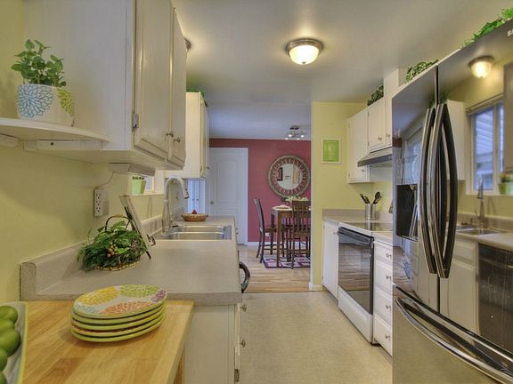 Back on Market! Buyer's Financing Failed!! Classic rambler! Light-filled interior, refinished hardwoods, tasteful colors, extensive updated lighting, solid six panel drs. Polished kitchen (applcs stay), and updated baths. And more: Newer vinyl windows, furnace, front door, roof, insulated pipes . . . the list goes on. Covered patio for year 'round outdoor living. Fenced yard, handy utility shed. Oversized two car garage with workbench, storage. Desirable corner lot! Convenient to amenities.